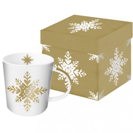 Porcelánový hrnek od německé značky PPD se zlatým potiskem vločky v dárkové krabici.