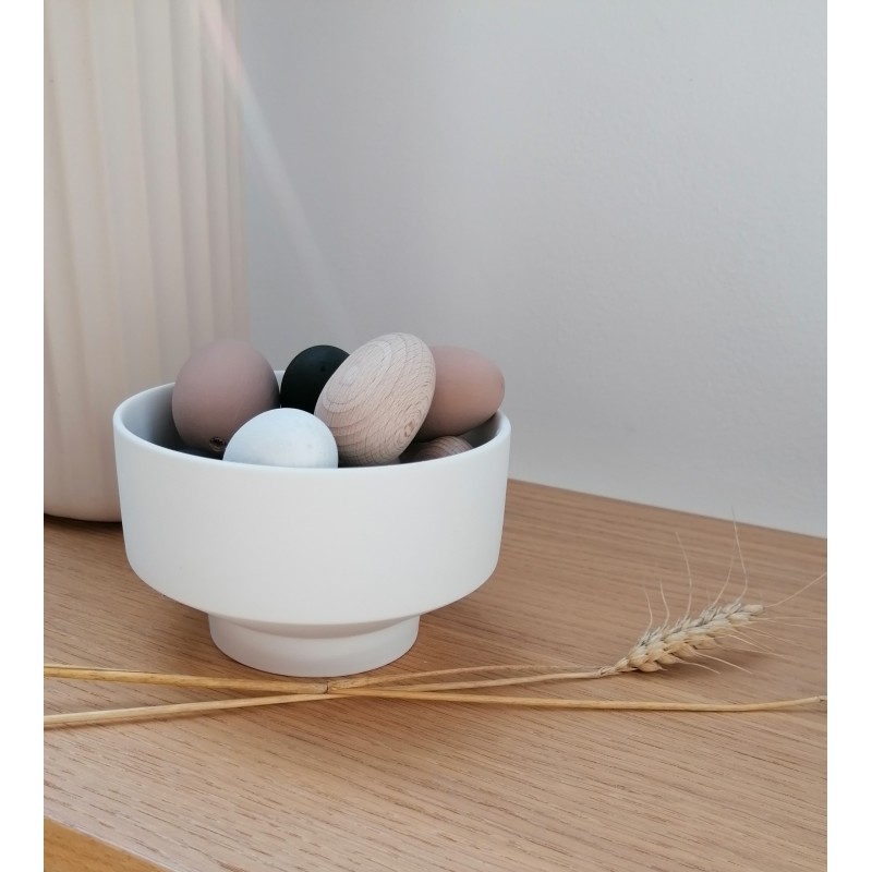 Keramická miska v matně krémové barvě. Tuto jedinečnou misku lze použít k uložení vašich oblíbených cukrovinek nebo ořechů. Je také krásná jako dekorativní předmět s větví eukalyptu.