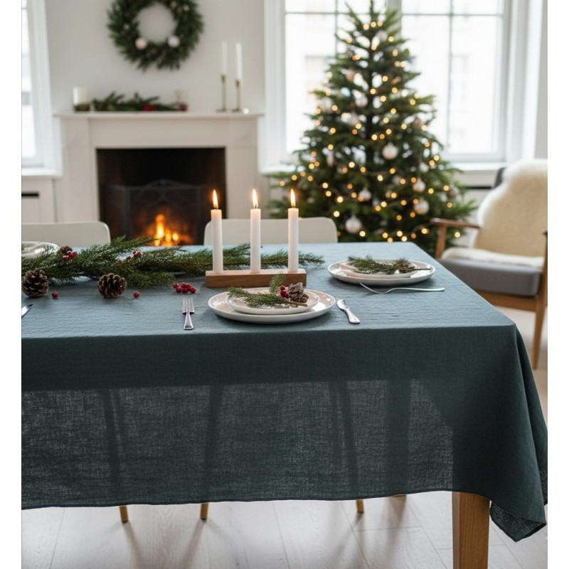 Krásný lněný ubrus v petrolejovém odstínu od dánské značky Broste Copenhagen.
