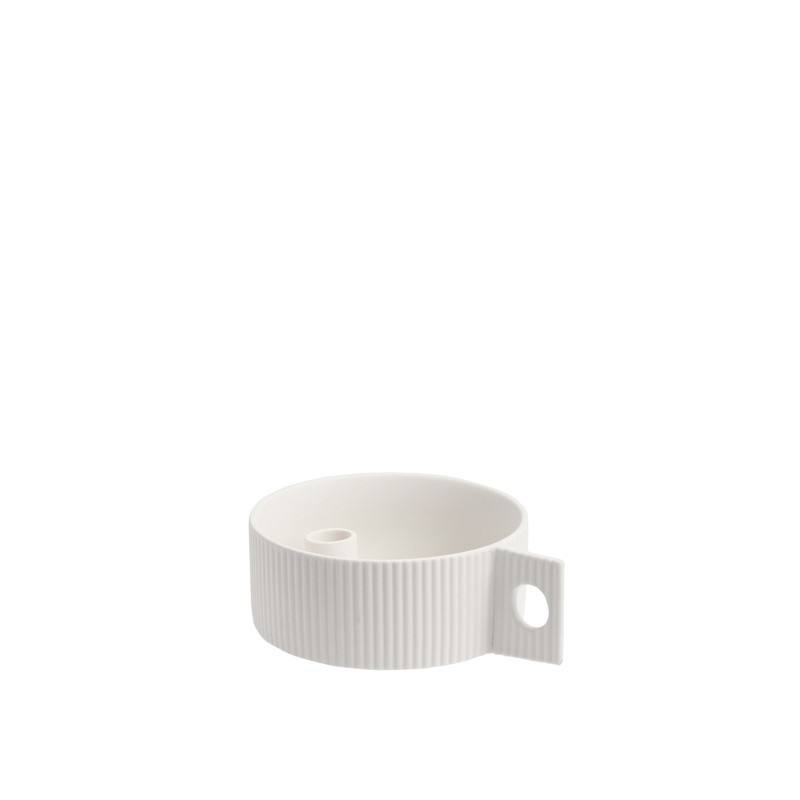 Vnější stranu zdobí plastické vertikální proužky spolu s designovým držákem, který svícnu dodává naprosto jedinečný vzhled.