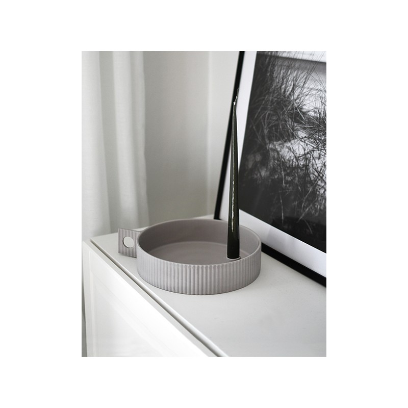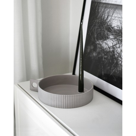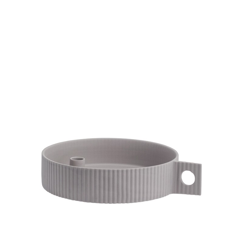 Vnější stranu zdobí plastické vertikální proužky spolu s designovým držákem, který svícnu dodává naprosto jedinečný vzhled.