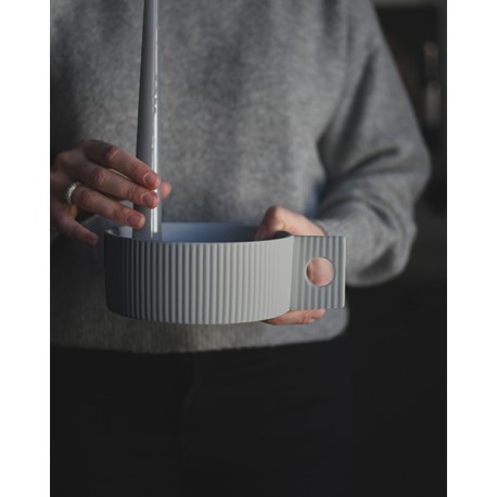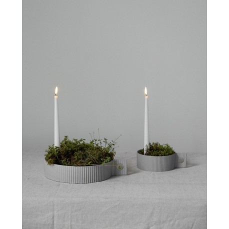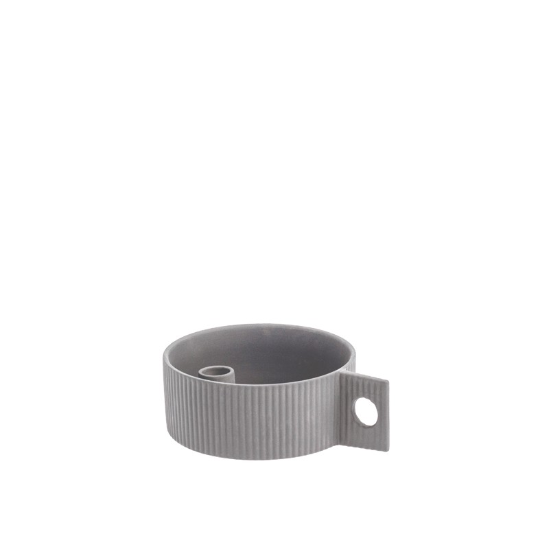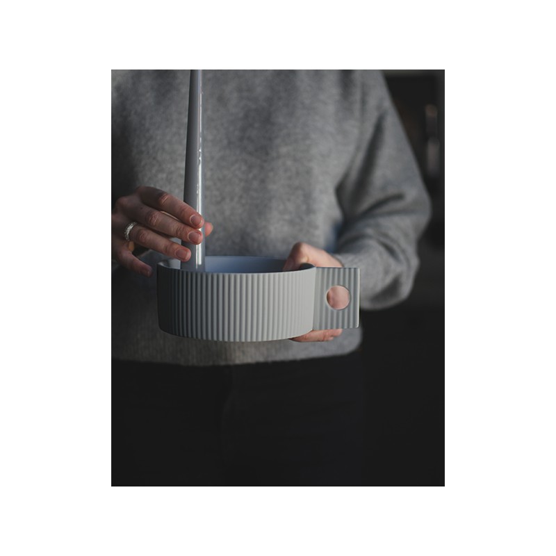 Vnější stranu zdobí plastické vertikální proužky spolu s designovým držákem, který svícnu dodává naprosto jedinečný vzhled.