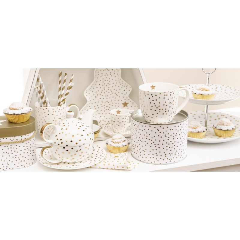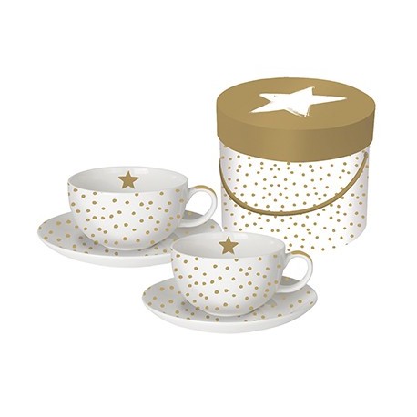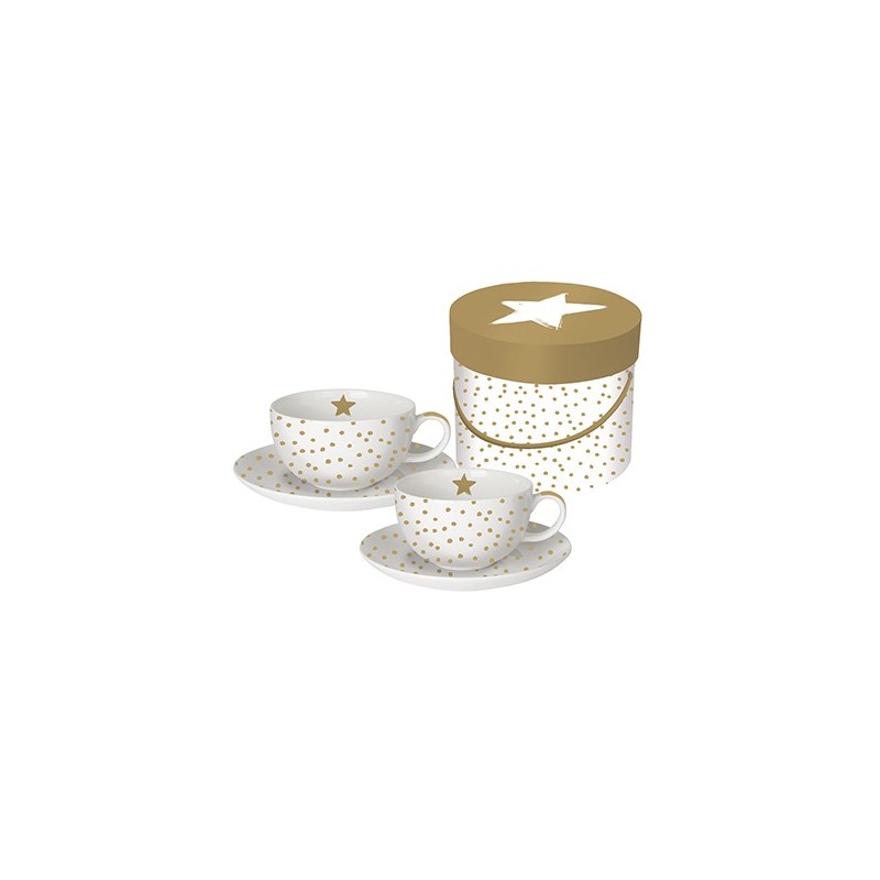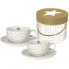 Dárkový set porcelánových hrnků na cappuccino se zlatými detaily, zabalen v krásné dárkové krabičce.