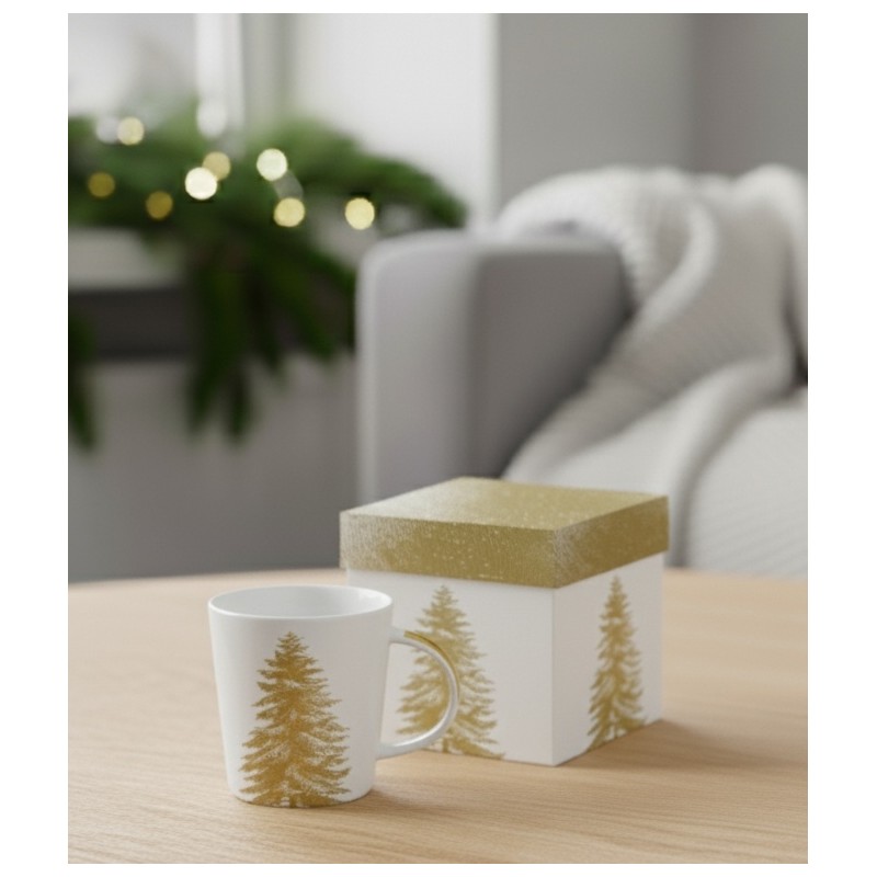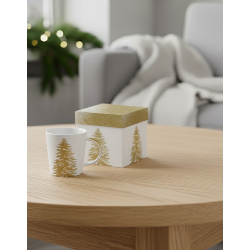 Porcelánový hrnek se zlatým potiskem stromku v dárkové krabici.
