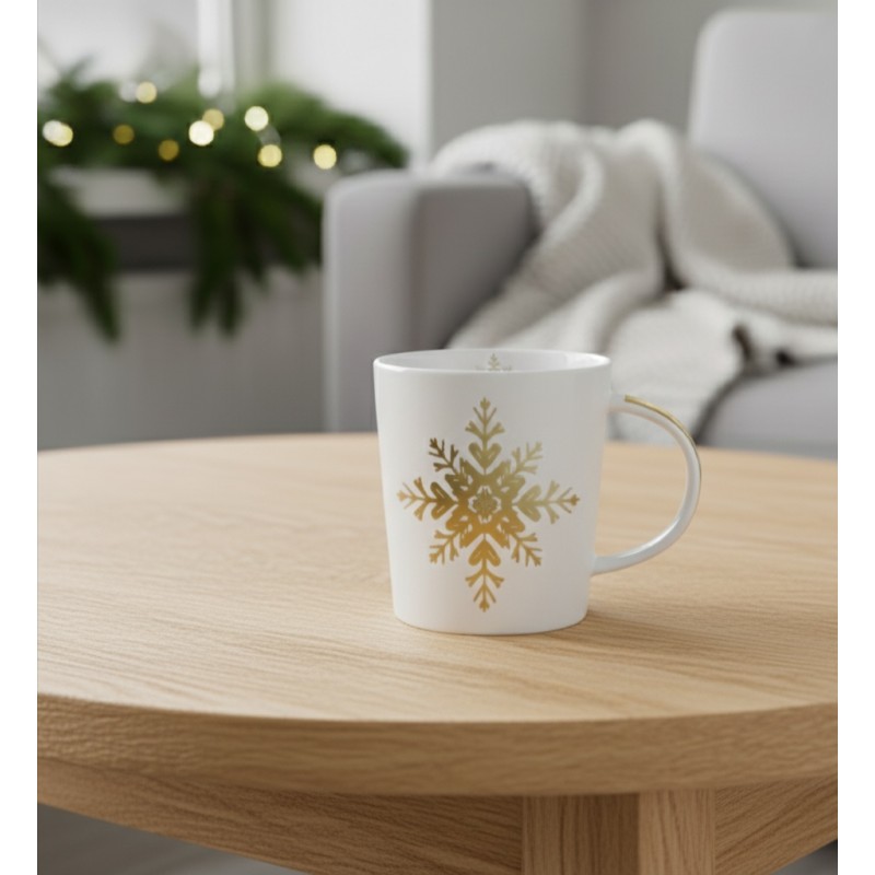 Porcelánový hrnek od německé značky PPD se zlatým potiskem vločky v dárkové krabici.