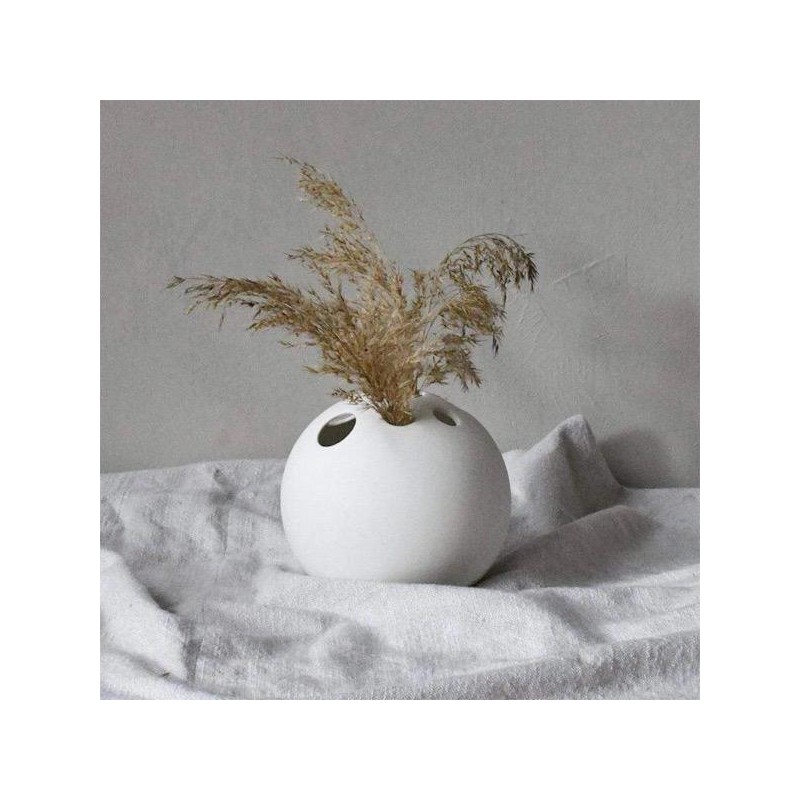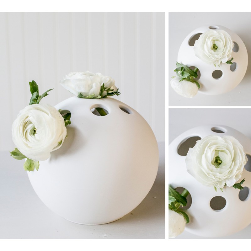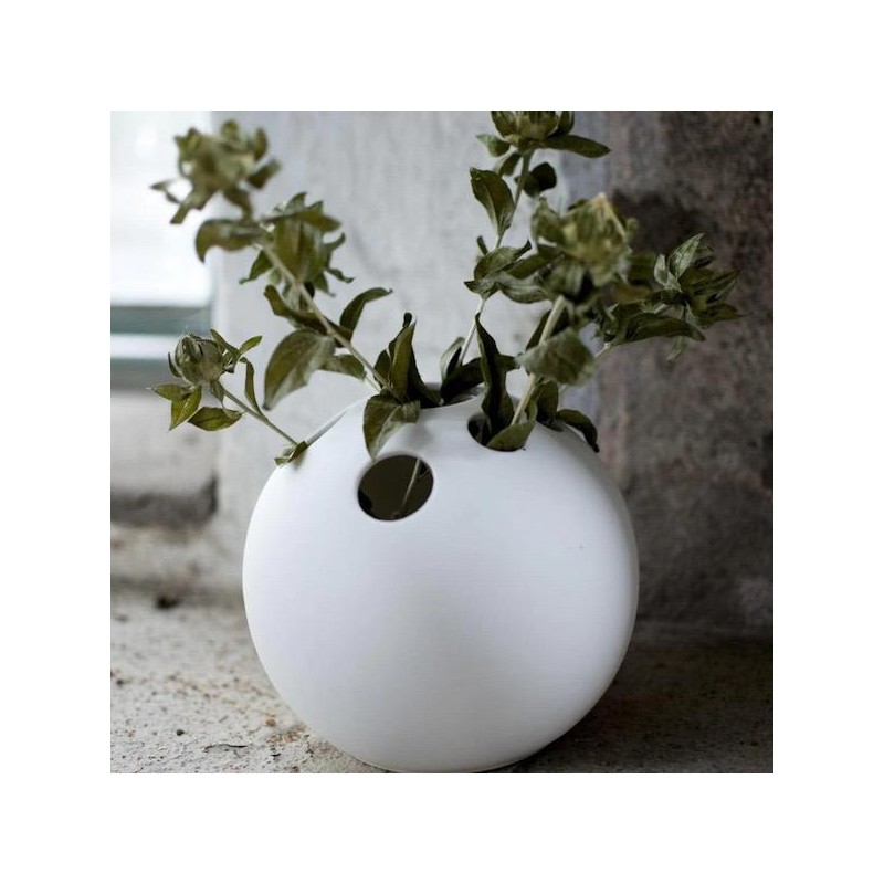 Kulatý tvar vázy a nepravidelné otvory na vrchní straně nechají skvěle vyniknout větvičkám, travinám nebo něžným květinkám.